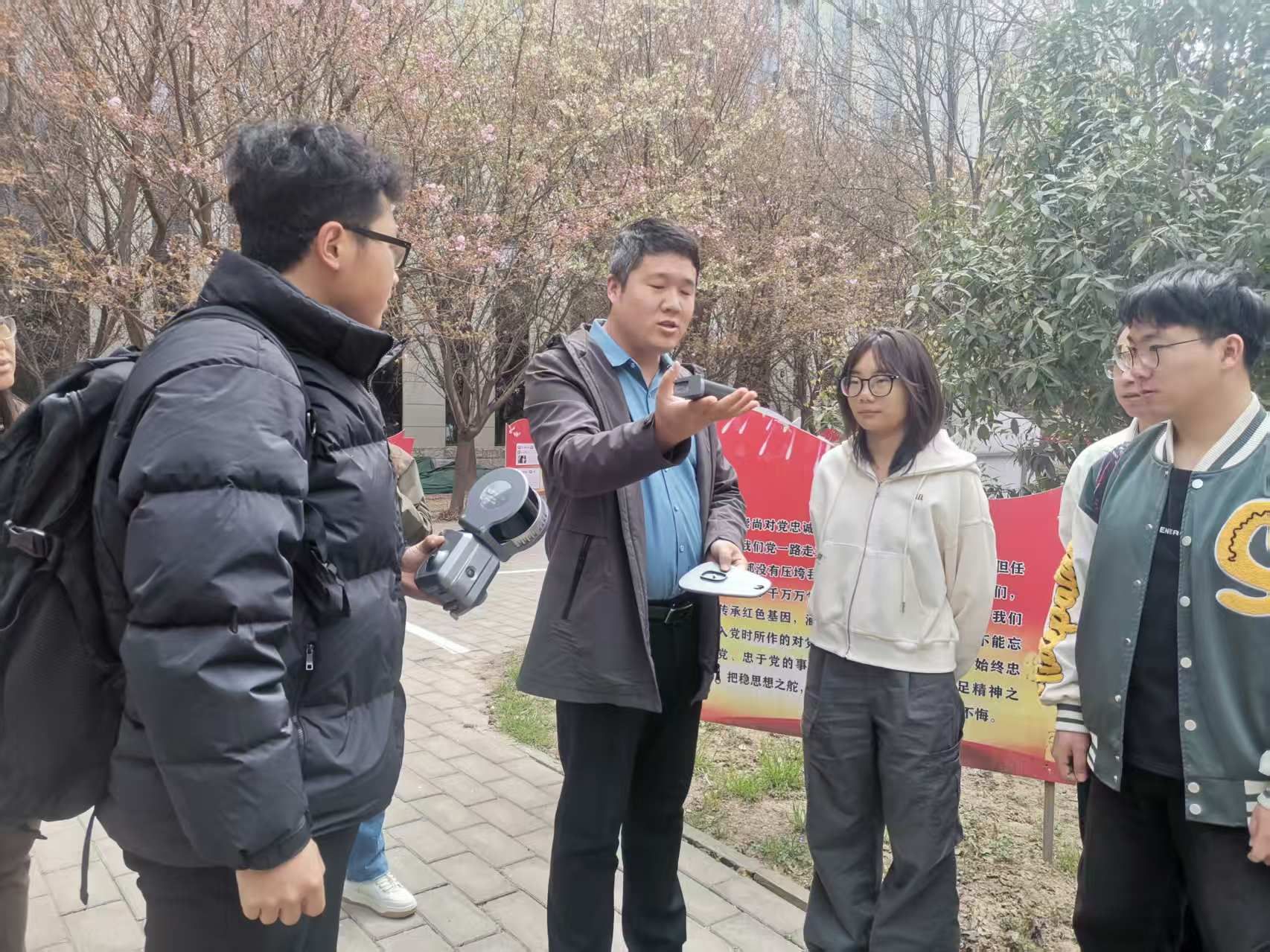技术工程师魏銘锋通过现场演示,向同学们展示了三维激光扫描设备的工作流程。他详细讲解了设备集成激光雷达、惯导、视觉模块等核心技术的特点,以及如何实现厘米级精度的数据采集。魏工程师还分享了多个实际项目经验,包括苏州环秀山庄数字化保护、城中村三维建模等典型案例,让同学们对行业应用有了更直观的认识。随后,同学们亲自采集了校园雕塑、教学楼、校园景观树的点云数据。