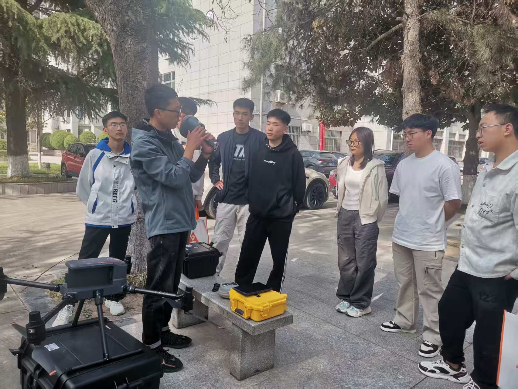 随后,师生们在一号教学楼前进行了智能测绘装备实践体验。王力和刘再东两位工程师现场演示并讲解这些设备的使用方法和功能特点。员工们近距离观察设备,聆听工程师的讲解,对智能测绘装备有了更直观的了解。员工们在工程师的分组指导下,使用 RS10 设备对校园标志性建筑进行数据采集,亲身体验了智能测绘装备的操作流程。在实践中,员工们不仅加深了对理论知识的理解,还感受到了智能测绘装备带来的便捷与高效。