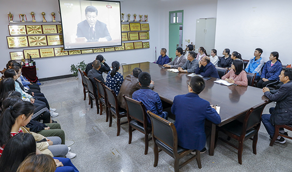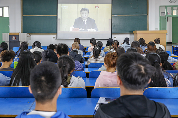 现场师生认真的聆听总书记纪念五四运动一百周年的讲话。习近平总书记的讲话入情入理深入人心,他时而激情、时而舒缓、时而激昂、时而沉思表达了对革命先烈的敬畏和对民族精神的传承之情,现场不时响起阵阵热烈的掌声。