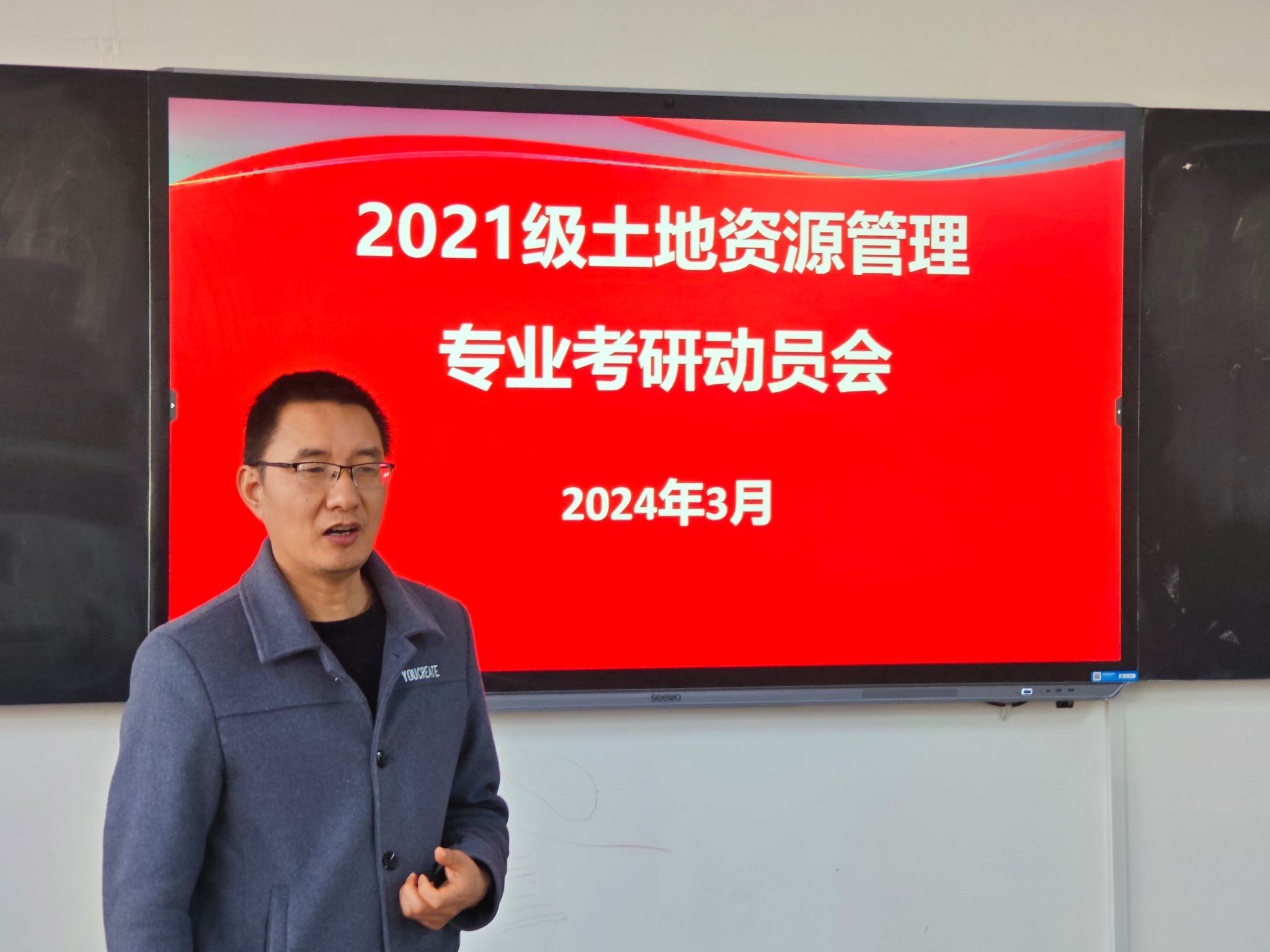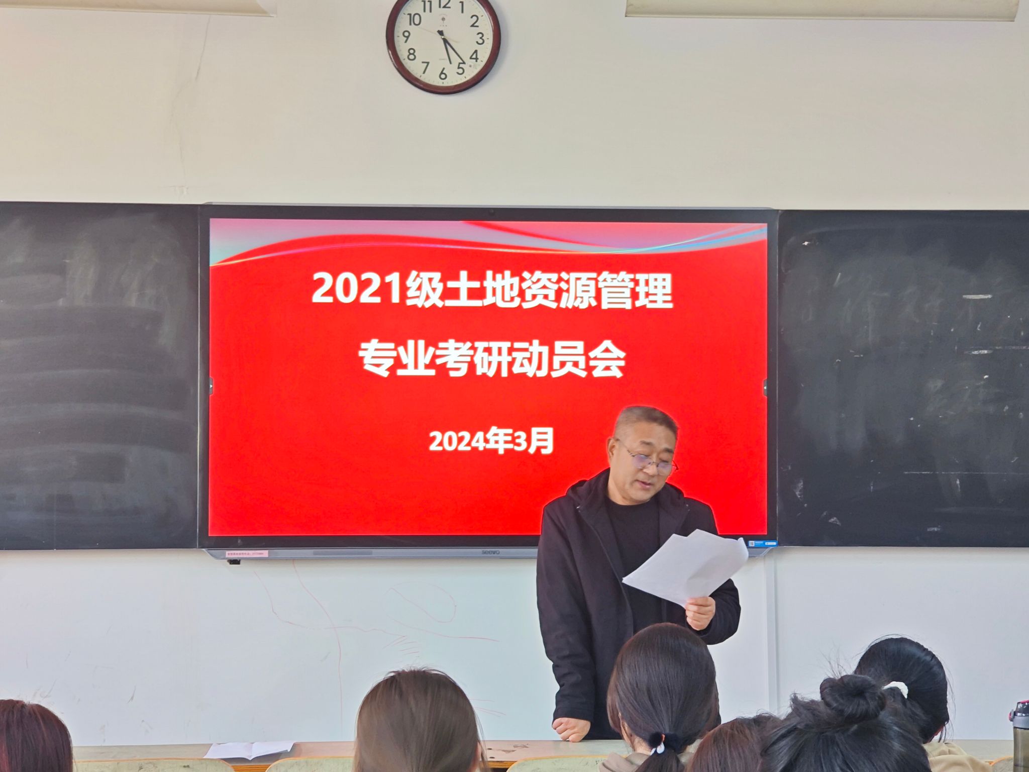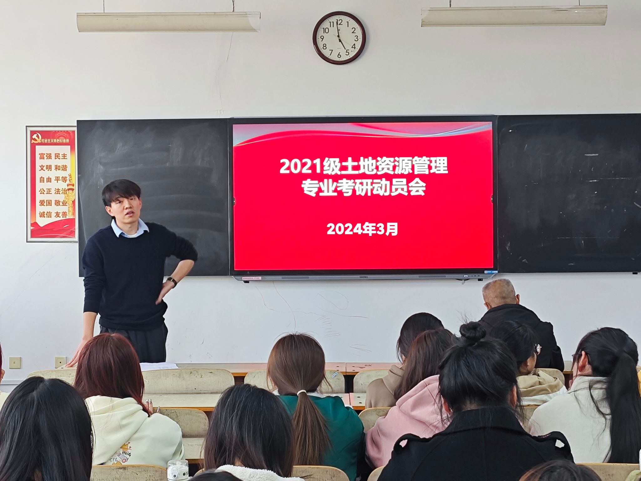 3月7日下午16:30,地环院土地资源管理专业2021级员工考研动员会在1-606召开,参加会议的有公司负责毕业生考研与就业工作的韩申山教授、土地资源管理王建兴、吴江老师以及土管2101班全体员工。