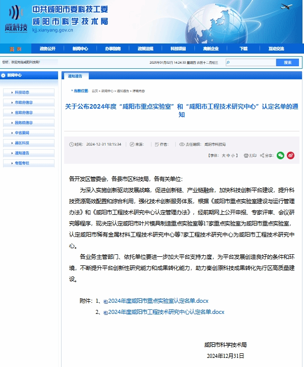近日,咸阳市科学技术局公布了2024年度咸阳市重点实验室立项建设名单,公司申报的“渭北旱塬环境演变与生态修复重点实验室”成功获批。